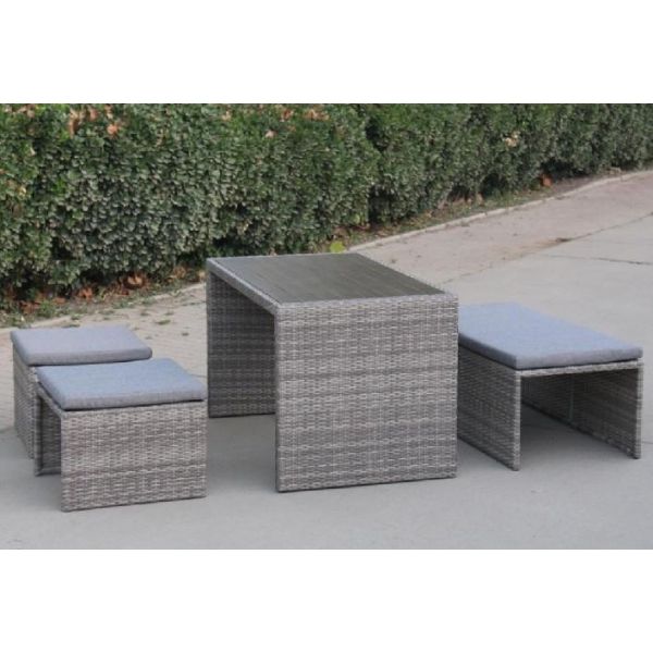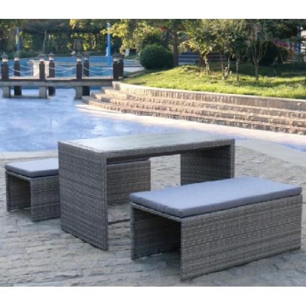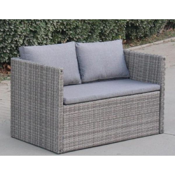 Доп. инфо:: В составе комплекта: диван, который трансформируется в обеденную группу: стол, лавочка и 2 пуфа. Высококачественная лоза из полиротанга серого цвета стойкая к любым атмосферным явлениям. Крепкий стальной каркас с полимерным антивандальным покрытием и отличным качеством сварки.